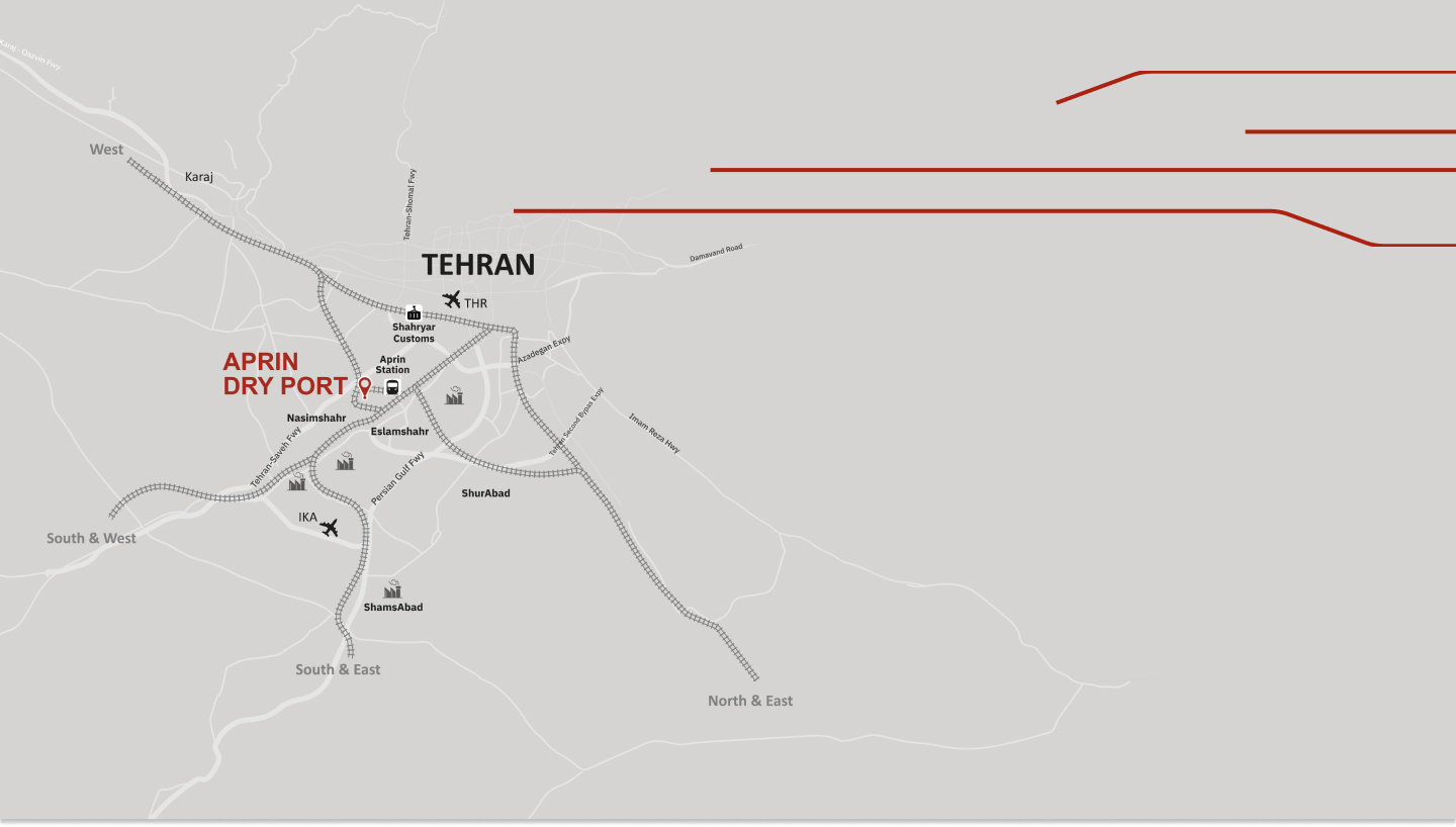 Aprin is Iran’s largest dry port, located near Tehran, providing bonded logistics, customs services, and direct rail access to southern ports like Bandar Abbas.